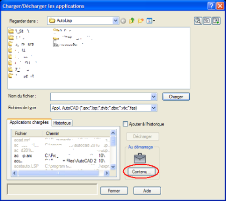Si vous souhaitez le charger automatiquement au démarrage d’AutoCAD, allez dans le menu \"Outils->AutoLISP->Charger une application\" puis sur le bouton \"Contenu\".