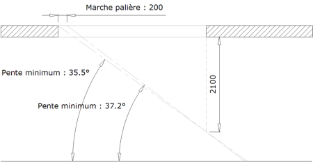 L’inconvénient de la marche palière dans les cas où la trémie n’est pas très grande est qu’elle réduit la longueur maximum de l’escalier et donc augmente la pente.