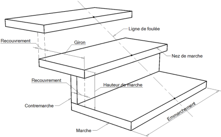 Le recouvrement, c’est la partie de la marche recouverte par la marche du dessus. Il n’est pas pris en compte dans le calcul mais il permet d’améliorer le confort de l’escalier.