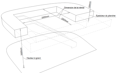Sur cet exemple, l’encombrement est déterminé par l’échappée suivant les dimensions de la trémie et l’épaisseur du plancher. Elle sera tracée à partir des différentes vues.