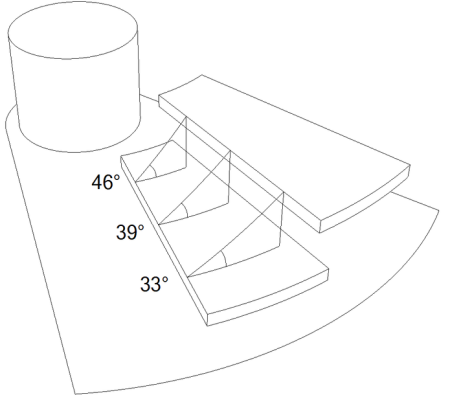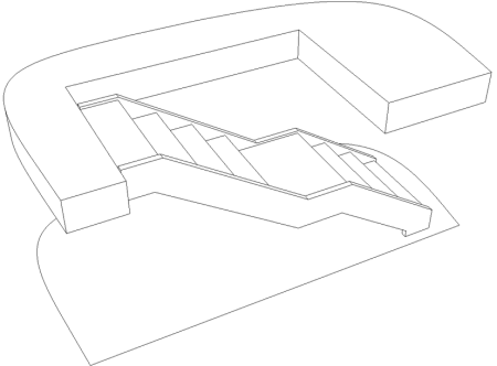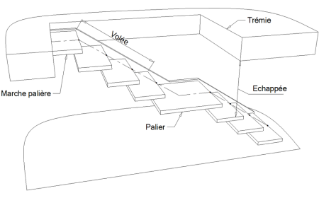Pour certains cas particuliers d’escaliers hélicoïdaux d’habitation, le calcul ne permet pas de trouver une solution en plaçant la ligne de foulée à l’axe de l’escalier ou à 0.5m de l’intérieur. On la positionne alors au 2/3 de la largeur en partant de l’intérieur de l’escalier.