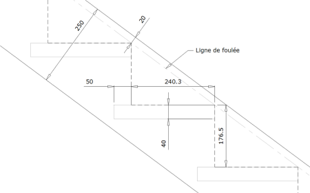 La ligne de foulée, c’est une ligne fictive symbolisant le déplacement d’une personne montant l’escalier. Elle passe par tous les nez de marches. Sa position varie selon la largeur de l’escalier (voir le prochain chapitre).