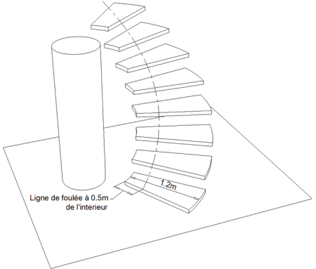 s’il est supérieur à 1m elle se situe à 0.5m de l’intérieur de la courbe. Cette règle n’a d’incidence que dans le cas d’un escalier courbe.