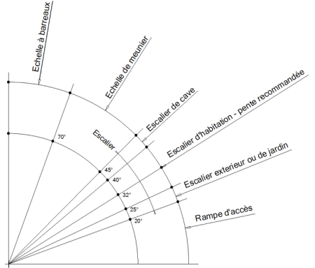 Voici la répartition des principaux escaliers en fonction de leur pente. L’angle de monté idéal pour un escalier d’habitation étant de 32°.